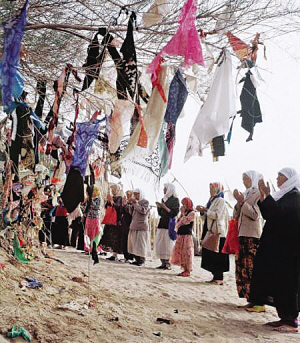 在新疆,尤其是在維吾爾族聚居的南疆,普遍存在類似內地廟會式的麻扎朝拜活動。朝拜者面向麻扎傾訴心中的哀怨痛苦,以各種方式表達自己的祈求:有向麻扎求消災避禍的,有求富貴發(fā)財?shù)模€有求夫妻和睦的,求理想伴侶的,求生兒育女的,求老有所養(yǎng)的,求天降甘霖的……