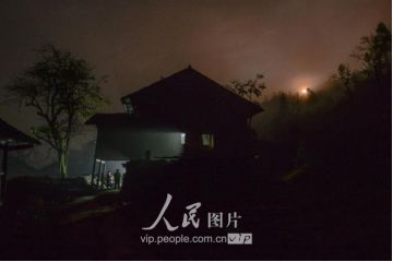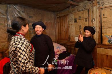 一般要到快過春節(jié)的時候,男方家才專門請人去接女方來洗糯米、打糍粑,新娘方能在夫家住上一夜;在來年農(nóng)忙時節(jié),又接女方來幫忙,夜里仍不能在男方家留宿,幫完忙當晚即回去,只有待到女方有身孕后,新娘才到夫家長住。圖為11月16日夜,新娘潘芝銀家為準備婚禮,燈火徹夜長明。