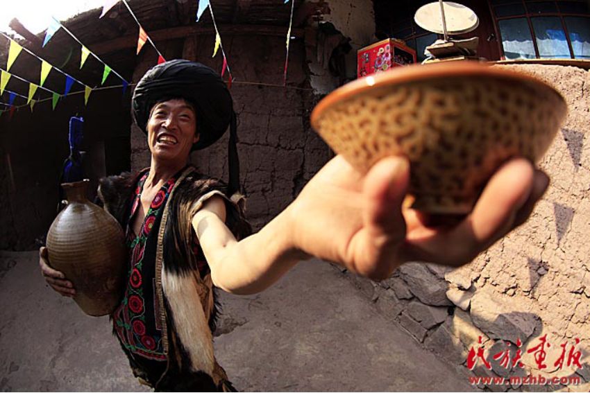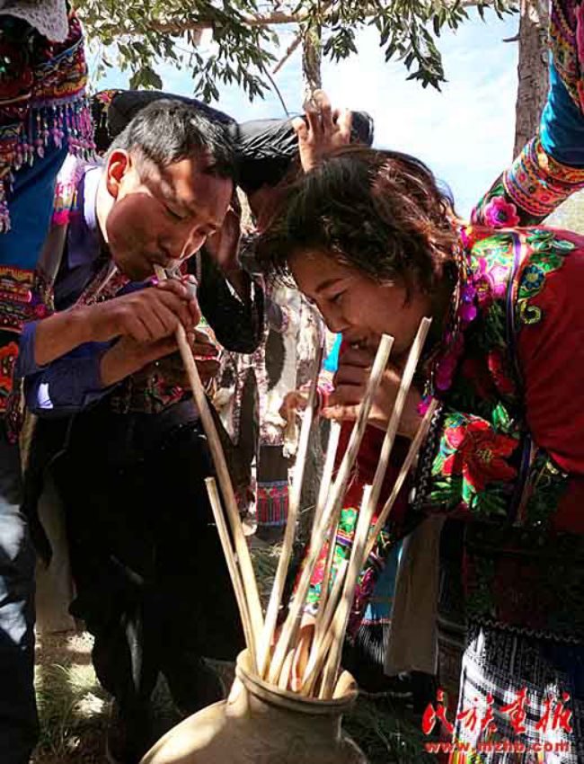 主人家抬出幾大壇米酒,拿出幾十根空心麻桿插入壇內,供吸吮米酒