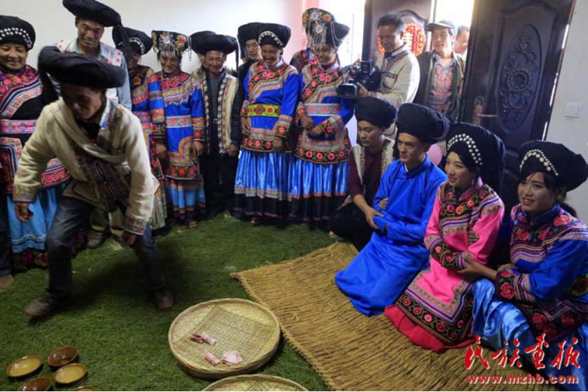 晚飯后,是新郎新娘參拜儀式,在香煙繚繞中,新郎新娘男右女左的并肩站在祖宗堂前,在主婚人洪亮的祈禱聲中,新郎新娘一拜天地,二拜祖宗,三拜父母,而后新郎新娘雙雙對拜。禮畢,主婚人要給新郎新娘取喜名,傈僳族婚禮中取喜名十分重要,結婚后只用喜名。取喜名是根據(jù)結婚時男方送往女家的彩禮來定的,也有以當時的氣候和其它情況為根據(jù)來定的。宣布喜名后,新郎新娘搶新房,比賽脫婚服,清點禮金和禮物,誰點的多,以后就由誰當家。