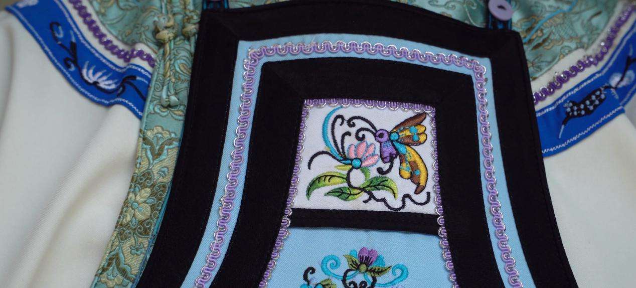 紅星村村內布依族村民保留有布依族傳統(tǒng)服飾,在日常生活中也還有穿著布依族服飾的習慣。紅星村布依族女性服飾做工精細,款式多樣。老人頭戴黑色圓帽,上身主要穿著灰白色斜襟上衣和青藍色打底的圍腰,上衣領口至兩肩處繡有大面積花紋圖案,圍腰上部也繡有花紋圖案作為裝飾。圍腰上的兩條絲帶系于身后,絲帶上繡有花紋圖案。下身穿著灰色長褲。