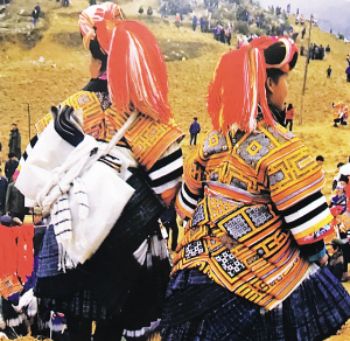 要論“疊穿”的數量之最,則當屬貴州大方縣顯母村的苗族女性了。與苗族慣用銀飾的固有印象不同,這里的苗族女性鮮以銀為飾,她們用數量極為可觀的服飾“疊穿”來彰顯富裕。節(jié)日里,顯母村的苗族女性換上盛裝——數條百褶裙系在腰間,塑造出豐腴的臀部造型,內層裙子素凈無花,外層裙子則布滿條帶狀蠟染裝飾。在這個難得的大型社交場合,未婚女孩通過“疊穿”后的獨特造型來展示自己的魅力,衣物的數量和精致程度成為了吸引異性、獲得肯定的重要標準和獲得美好婚姻的重要條件。到了婚禮時,女性所著裙子的數量更是可達35條?;楹?,她們要在裙邊加上一圈深色邊飾以作標識。