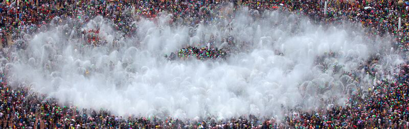 “??氨冗~”即傣歷新年節(jié)。傣歷一般以6月為首,5月為末。每年的新年是太陽沿黃道十二宮運行至白羊?qū)m之日,此時多為傣歷6月,所以有“楞賀??氨冗~傣”即“傣歷6月新年節(jié)”之說。新年到來,傣族人民都要舉行最隆重的“趕擺”慶?;顒樱话銥?-4天。第一天為舊年最末一日,傣語稱“宛多??啊?,即除夕;傣歷舊年與新年之間往往有1-2天的“空日”,傣語稱“宛腦”,既不是舊年又不是新年的日子;隨后才是新年元旦,傣語稱“麥帕雅宛瑪”,即“日子之王來到的日子”。新年間,各村各戶殺豬宰牛,做米干、米線,穿新衣、新褲,參加慶祝大會和“趕擺”活動。期間,在各村各寨的佛寺里都要舉行隆重的 “沐佛”活動,“沐佛”活動結(jié)束后,人們用純凈的水相互潑灑,相互祝福。這一活動慢慢演變和發(fā)展,形成了今天的“潑水狂歡”活動。屆時,成群結(jié)隊的民眾走上街頭,參與相互潑水祝福的狂歡活動,熱鬧非凡。因此,人們又把傣歷新年節(jié)稱為“潑水節(jié)”,“潑水節(jié)”就變成了傣歷新年節(jié)的代名詞。