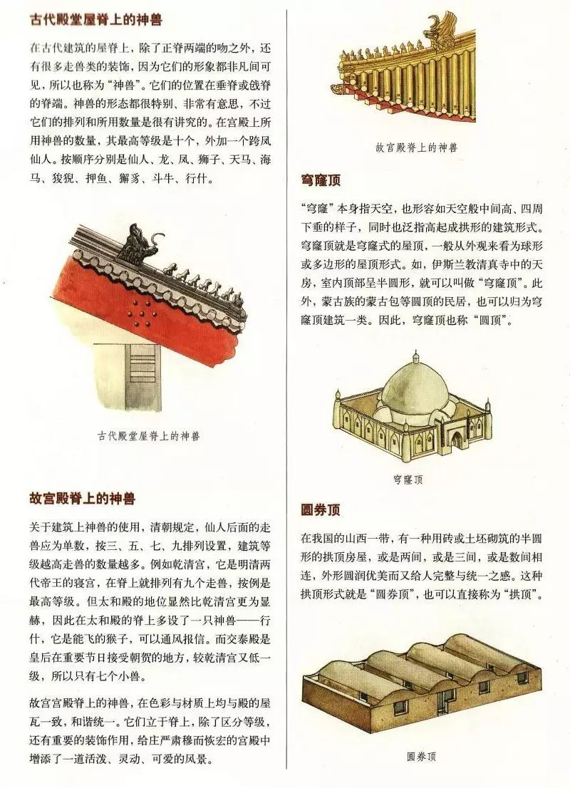 中國古代建筑屋頂不僅樣式多,而且組成部分也有好幾種,主要由屋面、屋脊等部分組成,而且有嚴(yán)格的等級(jí)制度。