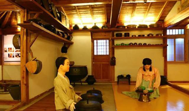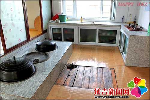 在傳統(tǒng)的朝鮮族民宅中,炕和鍋臺(tái)是平齊的,需要燒火做飯時(shí),主婦會(huì)打開架在柜臺(tái)一側(cè)的移動(dòng)木板,下到地面水平線以下的“灶坑”點(diǎn)火做飯。傳統(tǒng)的炕采用長(zhǎng)筒式結(jié)構(gòu),煙火由一洞內(nèi)循環(huán)排出,使每洞都有煙火串入,炕即溫?zé)?。朝鮮族的火坑高度為30-40厘米,但炕洞向下挖入,炕面抹白灰,表面糊油紙或鋪草簾子,炕面平整。隨著物質(zhì)條件的改善,炕面改鋪纖維板或者地板膠,既美觀又耐用。