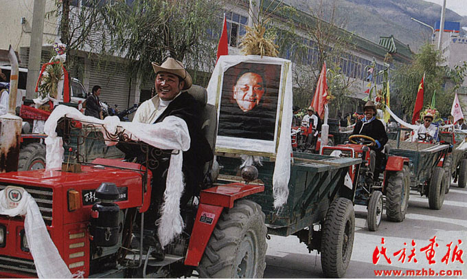 2004年8月21日,西藏山南地區(qū)乃東縣的農(nóng)牧民高懸鄧小平畫像,開著拖拉機在山南街頭巡游,表達對改革開放總設計師鄧小平同志的深切緬懷。改革開放后,西藏自治區(qū)農(nóng)牧民的年人均收入已從改革開放初期的幾百元上升至2004年的2000元左右,西藏城鎮(zhèn)居民年收入則超過7000元,位居西部前列?!睹褡瀹媹蟆?008年第12期