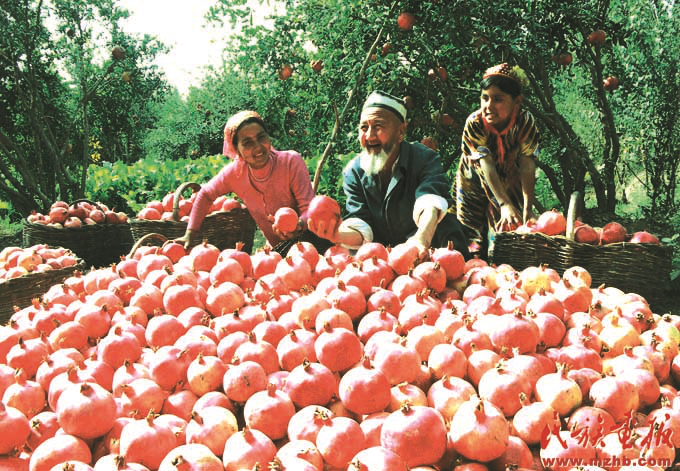 興邊富民行動是1999年中央民族工作會議部署的一項重要的邊境建設工程,旨在“富民、興邊、強國、睦鄰”。興邊富民行動為新疆的發(fā)展帶來了實惠,2006年,看著豐收的石榴,維吾爾族農(nóng)民樂開了花。《民族畫報》2007年7期