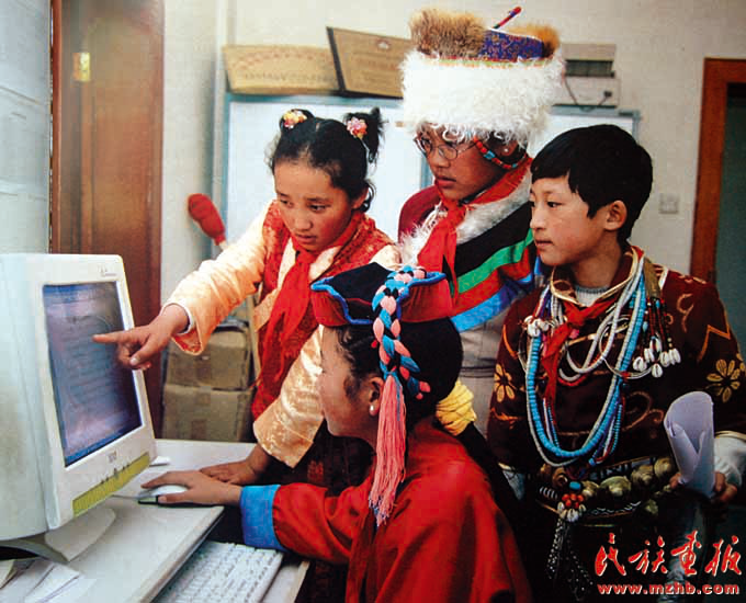 曾幾何時,電腦、網(wǎng)絡等現(xiàn)代化的交流手段離邊疆少數(shù)民族地區(qū)那么遙遠,隨著經(jīng)濟發(fā)展、國民消費水平的提高,一些高科技、現(xiàn)代化的事物在普通群眾中輕而易舉地普及了。圖為2007年,西藏門巴族、珞巴族的兒童在學電腦。(中國民族圖片庫資料)