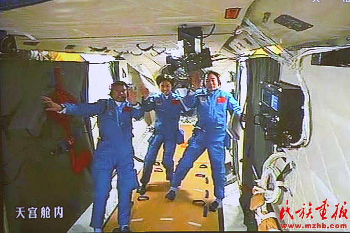 2012年6月18日,神舟九號飛船與天宮一號完成自動交會對接,兩飛行器形成穩(wěn)定運行的組合體后,三位航天員先后進入天宮一號目標飛行器,這實現(xiàn)了中國載人航天歷史上首次對一個在軌運行的航天器的拜訪和駐留。圖為在北京航天飛控中心大屏幕拍攝到的航天員景海鵬、劉旺、劉洋在天宮一號實驗艙內的畫面。《民族畫報》2012年第7期