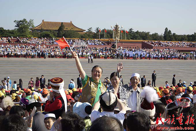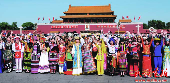 新中國成立以來,黨和國家始終堅持把馬克思主義民族理論同中國民族問題具體實際相結合,始終堅持把民族工作作為一項重大工作來抓,團結帶領全國各族人民共同團結奮斗,共同繁榮發(fā)展,開創(chuàng)了中國特色解決民族問題的正確道路,取得了舉世矚目的成就,積累了彌足珍貴的成功經(jīng)驗。2009年10月1日,在北京天安門廣場,20萬軍民以盛大的閱兵儀式和群眾游行歡慶新中國60華誕,圖為各民族學生參加“團結奮進”方陣群眾游行。《民族畫報》2009年第10期
