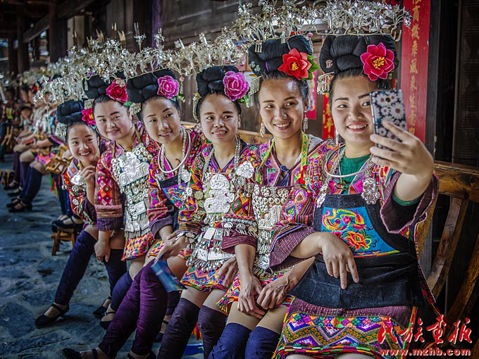 經(jīng)歷改革開放40年的發(fā)展,我國社會生產(chǎn)力、綜合國力、人民生活水平實現(xiàn)了歷史性跨越,全黨全國各族人民要更加緊密地團結在以習近平同志為核心的黨中央周圍,高舉中國特色社會主義偉大旗幟,不忘初心,牢記使命,將改革開放進行到底,不斷實現(xiàn)人民對美好生活的向往,在新時代創(chuàng)造中華民族新的更大奇跡。圖為貴州民眾盛裝自拍。《民族畫報》2018年第3期