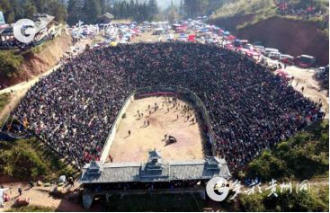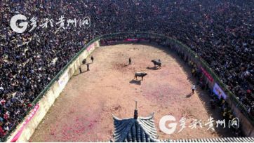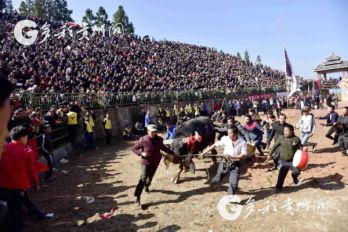 貴州省從江縣第十五屆原生態(tài)侗族大歌節(jié)的前一天,恰逢該縣逢亥斗牛日,丙妹鎮(zhèn)松學(xué)斗牛塘、谷坪鄉(xiāng)四寨河斗牛塘同時(shí)舉辦傳統(tǒng)牛王爭(zhēng)霸賽,喜迎一年一度“侗族大歌節(jié)”的到來(lái),共有來(lái)自周邊村寨的80頭水牯牛參戰(zhàn),斗?;顒?dòng)場(chǎng)上名牛角逐,場(chǎng)面異彩紛呈,吸引數(shù)萬(wàn)名觀眾前來(lái)觀戰(zhàn)。