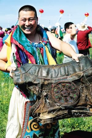 內(nèi)蒙古自治區(qū)正藍(lán)旗搏克手充滿補(bǔ)丁的祖?zhèn)黪右隆?巴義爾攝