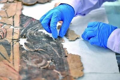 在山西大同云岡石窟研究院壁畫(huà)文物修復(fù)室,工作人員在進(jìn)行壁畫(huà)修復(fù)。新華社發(fā)