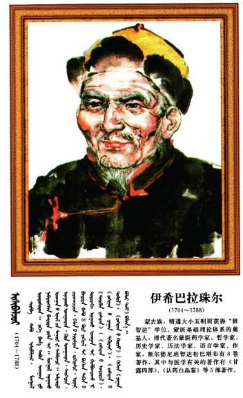 簡(jiǎn)介:伊希巴拉珠爾(1704~1788),蒙古族,一名也協(xié)班覺、額爾德尼班智達(dá)·松巴堪布,蒙古衛(wèi)拉特人,著名蒙醫(yī)學(xué)家、文學(xué)家、天文學(xué)家、哲學(xué)家。一生著作豐厚,其中對(duì)完善蒙醫(yī)理論體系有重要影響的著作有《甘露之泉》、《白露醫(yī)法從新》、《甘露點(diǎn)滴》、《甘露匯集》和《認(rèn)藥水晶鑒》[詳細(xì)]