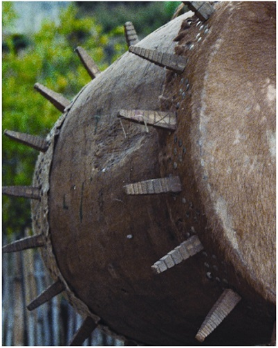 民族文化宮博物館藏基諾族木質(zhì)皮鼓,鼓面直徑55厘米,高88厘米,長(zhǎng)約130厘米,20世紀(jì)八十年代征集于云南省西雙版納州景洪縣基諾鄉(xiāng)。鼓身為木質(zhì),呈圓柱形,兩端對(duì)稱。鼓有兩面,用牛皮蒙制。兩端鼓面邊緣各環(huán)繞嵌有花紋的上方下錐形的木棍(一側(cè)17根,另一側(cè)為20根),木棍長(zhǎng)15厘米。鼓身兩側(cè)有方形孔,為鼓的音孔,上部有兩個(gè)把手,用于系繩懸掛木鼓。因鼓面兩端邊沿嵌有數(shù)十根鼓釘,形似太陽放射出的光芒,也稱為“太陽鼓”。