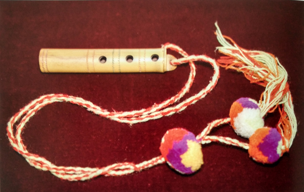 直笛,傈僳語稱之為“迪哩吐”(如圖),多用蘆葦制作,長約5寸,有4個(gè)圓孔,3孔在正面,1孔在背面,音量較小,音色柔和動(dòng)聽,為青年男女抒情和求愛必要的工具。