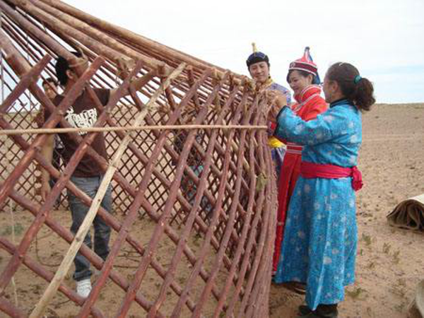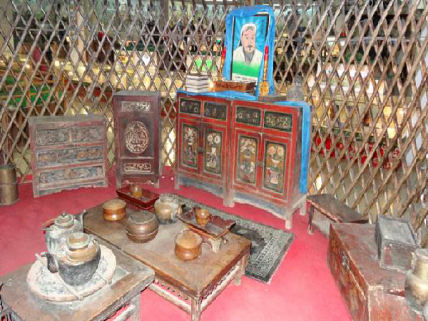 亞洲游牧、游獵民族創(chuàng)造的移動式民居,在其發(fā)展過程中形成了兩大流派:一種是中國鄂倫春人的傳統(tǒng)建筑歇仁柱式(在鄂倫春語里歇仁柱為“木桿屋”之意),即尖頂、用獸皮或樹皮、草葉子做苫蓋。另一種是蒙古包式的,即穹頂圓壁,主要用毛氈做其覆蓋物。蒙古包的包門開向東南,既可避開西伯利亞的強(qiáng)冷空氣,也沿襲著以日出方向為吉祥的古老傳統(tǒng)。而帳內(nèi)的中央部位,安放著高約二尺的火爐?;馉t的東側(cè)放著堆放炊具的碗櫥,火爐上方的帳頂開有一個天窗?;馉t西邊鋪著地氈,地氈上擺放矮腿的雕花木桌。包門的兩側(cè)懸掛著牧人的馬鞭、弓箭、獵槍以及嚼轡之類的用具。帳內(nèi)的西側(cè)擺放著紅漆彩繪木柜,木柜的北角上敬放著佛龕和佛像,佛像前供放著香爐及祭品。