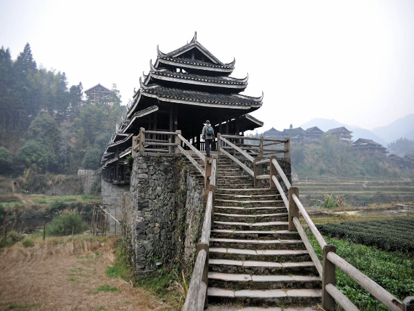 風(fēng)雨橋以石拱木作,廊、屋、亭、閣為一體,造型別致、美不勝收。無(wú)論是遠(yuǎn)眺還是進(jìn)觀,都體現(xiàn)出獨(dú)特的審美意境。鏈接廊橋與屋亭的是長(zhǎng)條青石,橋與村寨的連接則用花石鋪路,橋面主體是當(dāng)?shù)厮寄静?。這種自然生態(tài)環(huán)保的理念,更彰顯了瑤族人民獨(dú)特的審美境界。