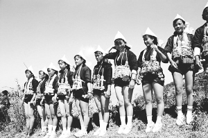 “仰阿娜節(jié)”時,十村八寨的姑娘、小伙們?nèi)绯彼銋R聚到大羊街鄉(xiāng)的孟子轟都山。小伙子們懷揣定情信物,姑娘們手持小白傘,腰挎小三弦,大家又唱又跳,歡聲笑語。此時,奕車姑娘裸露的美腿成為姑娘們相互嬉鬧的對象。只見她們從松樹上摘下松葉,悄悄走到伙伴跟前,往伙伴腿上一扎。被扎的姑娘“哎呦”一聲驚叫,還以為被什么蟲子咬了。小伙子要是看上中意的姑娘,就會悄悄拉著姑娘躲到松林僻靜處去訴說衷腸。