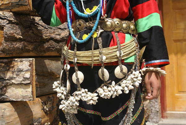 珞巴族男女都喜歡佩帶裝飾品,男子戴手鐲、竹管耳環(huán)、項(xiàng)鏈,腰間掛弓箭、長(zhǎng)刀等物。婦女特別喜歡佩戴五顏六色的項(xiàng)珠,盛裝的婦女脖頸上有時(shí)戴十幾串到幾十串珠子,再加上手鐲、耳環(huán)、銅鈴、銀幣、鐵鏈、小刀、火鐮、海貝等飾物,有十幾斤重,可裝滿一個(gè)竹背筐,并被視為家庭財(cái)富多寡的標(biāo)志,不可缺少的嫁妝。