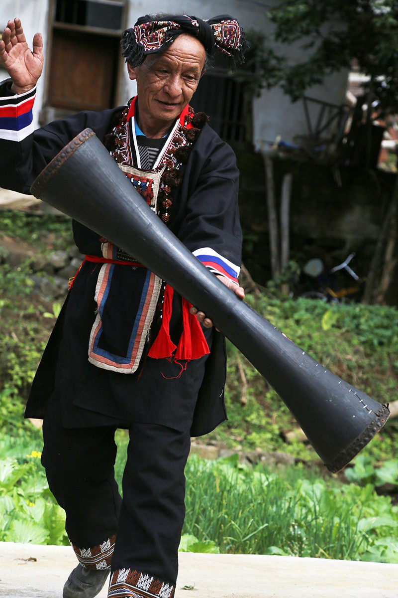 聽罷門唻歌,再賞羊角長鼓舞。轉(zhuǎn)鼓、跨步、收腿、回腰、碰角……這套由多人合作的舞蹈,動作粗獷,節(jié)奏明快,舞者配合默契,音韻鏗鏘。今年66歲的老藝人盤福貴,舞起祖宗留下來的已有一百多年歷史的羊皮長鼓,身手矯健、動作敏捷,讓人驚嘆不已。盤福貴的爺爺、父親都是跳羊角長鼓舞的高手,父親把這項(xiàng)技藝傳授給他,如今他又收女兒和孫子為徒,已是五代傳承了。
