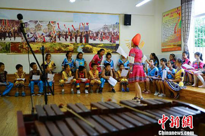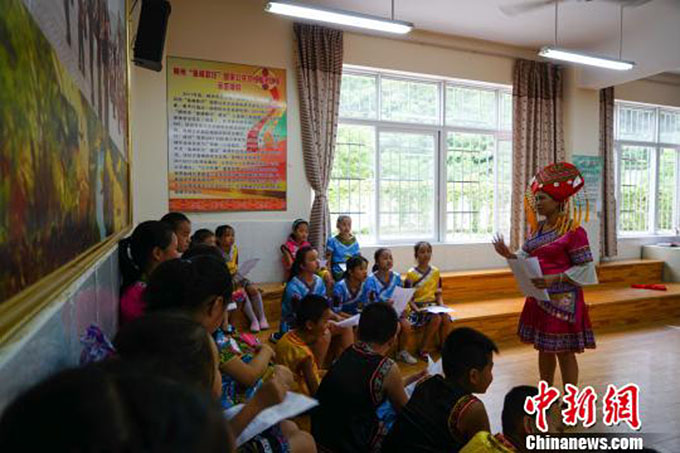 廣西“山歌王”陸連芳給孩子們上課( 林馨 攝影)
