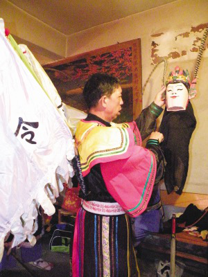 請“臉子”是地戲表演時一個非常講究的開場儀式?!巴捅さ貞颉钡恼埬樧觾x式通常是整個戲班子的人都必須參加祭拜。表演時必須鄭重地從箱子里請出珍藏的“臉子”,“臉子”才具有神的靈性??墒俏覀兛吹降拇笳家赖貞颍诒3謧鹘y(tǒng)的同時又不失自己的個性。通常請“臉子”是由當地長老一個人完成所有的祭拜過程,一切都是那么簡單。祭拜中都是用當地的布依話娓娓道來,這樣的表演給它增添了別有的韻味。