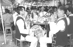 接著婚宴開始,八音隊吹奏的樂曲優(yōu)美動聽,大家喝喜酒祝賀新郎、新娘;同時,男方家的帶娘給女方家人開檳榔碗。開檳榔碗的順序是女方家人由老到小分別接檳榔碗,意在感謝女方長輩、親屬對新娘的養(yǎng)育之恩。