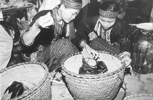 按照黎家人的規(guī)矩,“提親”是由男方家人請族內(nèi)的一位親嫂嫂當(dāng)媒人,帶著檳榔、簍葉、煙絲到女方家。如女方本人及家人樂意接受禮品,說明親事已定下來了。