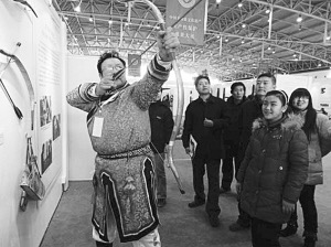 日前,在北京舉行的非遺生產(chǎn)性保護(hù)成果大展上,幾名觀眾圍攏在一個(gè)身材魁梧的錫伯族老人周?chē)?,但?jiàn)他身罩長(zhǎng)袍,足踏薄底靴,雙目圓睜,兩臂運(yùn)力搭弓上箭,儼然就是準(zhǔn)備步射的驍將。這位老人就是錫伯族傳統(tǒng)弓箭技藝傳承人伊春光,老漢手中的弓重近1公斤,是他親手制作的。