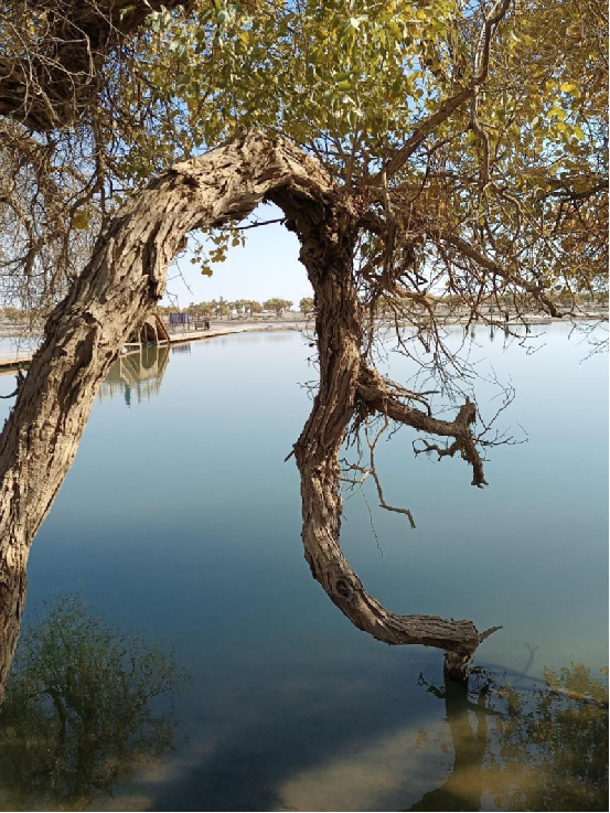 每當深秋季節(jié),胡楊樹葉變得一片金黃,形成胡楊秋色,樹影婆娑,奇妙絕倫,賞心悅目。漫步在濃郁的胡楊林中仿佛進入神話般的仙境。茂密的胡楊千奇百怪,神態(tài)萬般。粗壯的幾人難以合抱,挺拔的七、八丈之高,怪異的似蒼龍騰越,似虬蟠狂舞,令人驚奇不已,嘆為觀止。僅就密密匝匝的樹葉,也是風采獨有。幼小的胡楊,葉片狹長而細小,宛若少女嫵媚的柳眉,人們常常把它誤認為柳樹;壯齡的胡楊,葉片又變成卵形、闊卵形或三角形,猶如興安嶺的白樺;進入老年期的胡楊,葉片才定型為橢圓形。更令人稱奇者,在同一棵胡楊樹冠的上下層次,還長著不同形狀的葉片,因此,又稱“異葉楊”