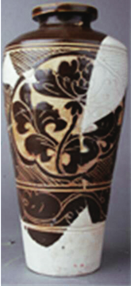 褐釉剔刻牡丹花紋經(jīng)瓶,高32厘米、口徑8.3厘米、腹徑15.7厘米、底徑9.2厘米,二級(jí)文物。肩腹部三組雙弦紋將器身分為三部分,上部前后對(duì)稱兩開(kāi)光,五瓣圓形葵口內(nèi)剔刻一朵折枝牡丹紋,花瓣舒展呈傘狀,桿莖弧曲略呈S形,兩側(cè)各有一枝對(duì)稱的褶邊復(fù)葉,開(kāi)光外劃刻斜向弧線紋。中部劃刻一周卷葉紋。下部素面。殘存口腹大部,其余為后期修復(fù)。