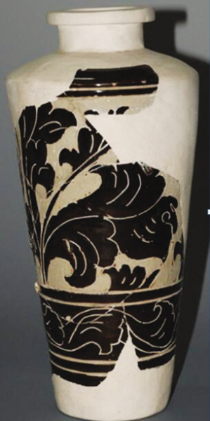 西夏經(jīng)瓶是靈武窯最具特色的西夏器類之一,其器型瘦長(zhǎng),肩部最寬,下腹?jié)u收,平底,假圈足;胎質(zhì)細(xì)膩致密,外壁施釉均不到底,內(nèi)壁施滿釉,釉色以褐釉為主,也有黑釉,白釉少見(jiàn),白釉瓷均施化妝土;紋飾以牡丹花為主,也有菊花,少見(jiàn)海棠花,輔紋以海水波浪紋和斜線紋為主,花紋細(xì)膩,構(gòu)圖流暢,疏密得當(dāng);整體構(gòu)圖大量使用開(kāi)光,搭配合理,講究對(duì)稱。