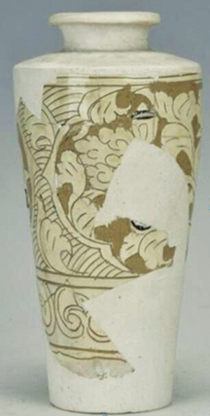 褐釉剔刻菊花紋經(jīng)瓶,高32厘米、口徑8.8厘米、底徑8.9厘米,三級(jí)文物。腹部四分葵口紋內(nèi)剔刻開(kāi)光折枝菊花紋,花瓣細(xì)密舒展,四周花葉搖曳有動(dòng)感,開(kāi)光外刻劃花葉紋和弧線紋。其下為兩組雙線弦紋,施褐釉。殘存肩及腹部一半,其余為后修復(fù)。