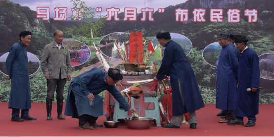 祭祀活動(dòng)由寨老主持。牛頭、活雞等祭品供于案前,寨老穿著布依族的藍(lán)袍,誦頌著古老神秘的經(jīng)文,黝黑的臉上寫滿了對(duì)祖先、神靈的虔誠。而其他幾位德高望重的寨中老人,這時(shí)便協(xié)力殺了雞,人們用雞血淋紙旗插于火盆中,以火盆代替稻田,意為雄雞吃盡蝗蟲,糧食豐收,馬馱不盡。