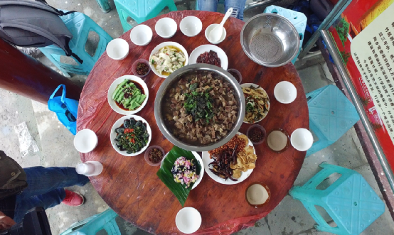 喝罷三碗阿姐手中的米酒,這滿桌的美食就等著動(dòng)箸了。長桌宴席的主菜,即是為了“六月六”祭祀而宰的牛。那一大盆牛肉堆積如山,面上灑滿薄荷,清香四溢,味美量足,一桌人都吃不完。一方面足見布依人民的豪爽,另一方面也許是為了大家相聚的時(shí)間更多,在餐桌上把酒言歡。