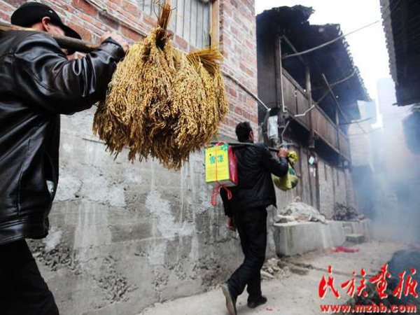 賀禮是街坊鄰居送給新娘家的禮品,在婚禮結(jié)束后的第一天下午進(jìn)行。送賀禮由中老年婦女承擔(dān),送時(shí)或單獨(dú)或結(jié)伴而行,禮品或手提或裝在竹筐里,一般都要帶上若干份,每戶一份,一次送完。禮品送到新娘家后,新娘家要進(jìn)行登記并送幾塊餅干糖果以表謝意。