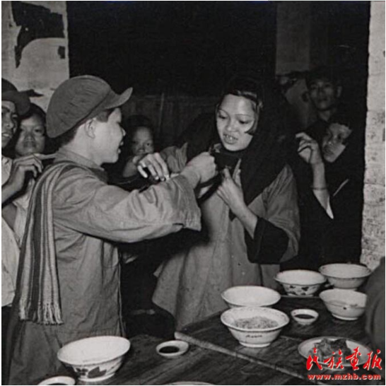 “歌圩”是桂西壯族古老的風俗。每年農(nóng)歷正月、二月、四月都有歌圩日。圖為1957年廣西壯族自治區(qū)憑祥市郊區(qū)的歌圩日,這里不但處處歡歌笑語,還有搶花炮、演壯戲、舞彩龍、舞彩鳳、唱桂劇等很豐富的文娛活動