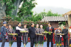 黔西南州領(lǐng)導(dǎo)和望謨縣委書記鄧家富(右三)、縣長(zhǎng)黃興文(前排左三)為望謨縣各族人民和各位來賓祈福,播撒幸福種