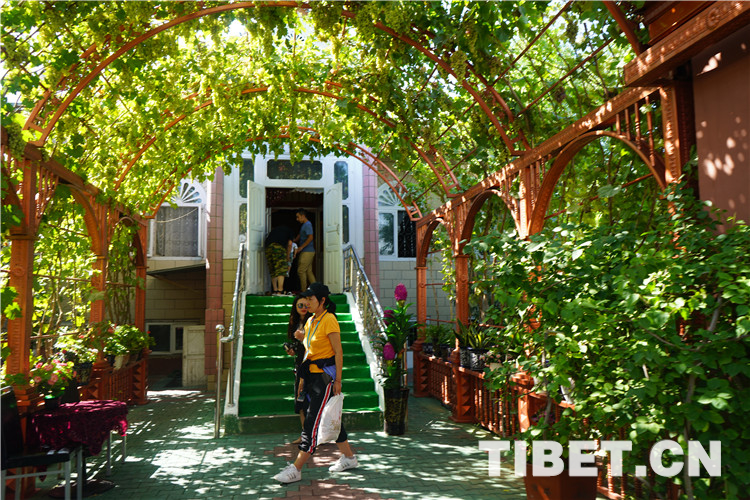 除了古老的純木質(zhì)結(jié)構(gòu)民宿,喀贊其還有各式磚石結(jié)構(gòu)的民居。院落寬敞明亮、華麗氣派,家家種植著花草、蔬菜,郁郁蔥蔥、生機盎然,葡萄廊架已成為每家的“標(biāo)配”,葡萄架下是家人休閑、朋友聚會的地方。圖為當(dāng)?shù)孛窬釉簝?nèi)。