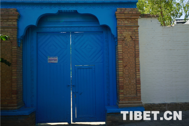 目前,喀贊其仍保留著一定數(shù)量的文物古跡,包括自治區(qū)級文物保護單位1個(陜西回族大寺),市級文物保護單位7個,另有12處清真寺建筑。圖為具有當(dāng)?shù)靥厣呐R街藍(lán)色大門。