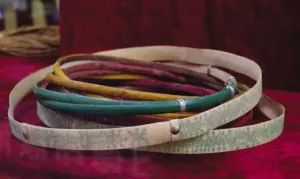 直到今天,腰箍仍在德昂族服飾中占有重要位置。按德昂人的習(xí)慣,姑娘成年后,就要在腰部佩上若干腰箍。這些腰箍大多用藤篾編成,藤圈寬窄粗細(xì)不一,有的漆成紅、黑、綠等色;有的刻上花紋,包上銀皮、鋁皮;還有的一半是藤篾,一半是銀絲。姑娘們以腰箍多、腰箍美為榮。因此,在戀愛期間,小伙子為了討姑娘歡心,往往費(fèi)盡心機(jī)地制作精巧的腰箍相贈(zèng)。腰箍從傳說的用來“拴住人”,演變成為用來“拴住心”。