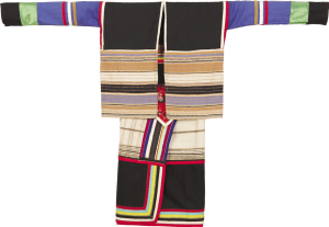 北京服裝學院民族服飾博物館藏基諾族砍刀布鑲彩條女套裝。李昕/圖
