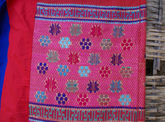 三角鉤鋤是毛南族特有的生產(chǎn)工具,毛南語叫“拱”。它小巧輕便,適合在雞窩地里中耕鋤草,又用于點種黃豆。種黃豆還有一種木制的“點穴錘”,用8寸到1尺長的金剛木削成圓桿,形如搟面杖,中間插一木柄,手握木柄在泥土里一錘,就成一個如雞蛋形的坑,即可放入黃豆,蓋上草木灰。這種“點穴錘”一錘一穴,工效很高,是種黃豆的最佳農(nóng)具。此外還有禾剪、割煙刀等(圖為毛南族織錦)。