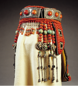 【圖為清代鄂爾多斯珊瑚松石銀牌鏈盛裝頭飾,中央民族大學(xué)民族博物館館藏】