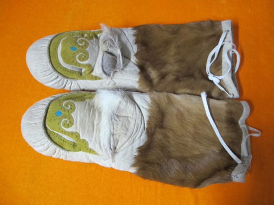 此外鄂倫春人還有被稱為“瓦拉開(kāi)依”的手套,它和北方人做的棉手悶子一樣,是拇指同其他四指分開(kāi)的手套,手心處無(wú)開(kāi)口,戴這種手套可以保暖,也可以拿比較笨重粗大的東西,但不能射獵。另一種被稱為“沙拉耶開(kāi)依”,是五指手套,即五指分開(kāi),戴這種手套拿東西或射擊都很方便,但保暖性能差,多為青年人喜愛(ài)和佩戴。鄂倫春人冬季出獵,一般還是喜歡戴“考胡魯”。以上三種手套多用狍皮制作,五指分開(kāi)的手套也有用鹿皮制作的。