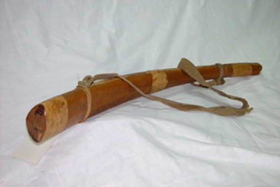 鄂溫克族牛角形帶箍木質(zhì)鹿哨,長71厘米,紅松木質(zhì)地,1946年制作,鄂溫克族傳統(tǒng)擬聲狩獵工具,也作為樂器。征集于內(nèi)蒙古自治區(qū)喀爾古納左旗,藏于民族文化宮博物館。鹿哨是中國北方及東北亞狩獵經(jīng)濟(jì)文化類型的重要實(shí)物遺存,有鮮明民族與地域特色。