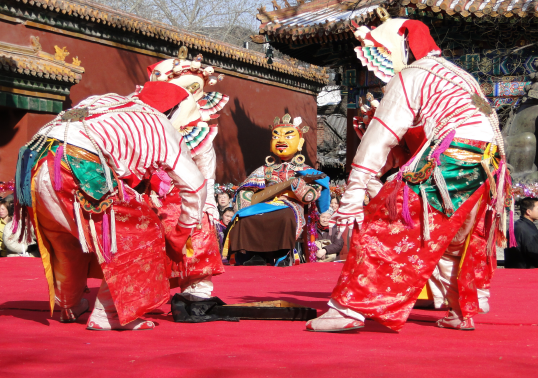 查瑪樂舞從整體上看應(yīng)包括內(nèi)查瑪、外查瑪、索日扎拉火(也稱送祟)三個部分組成?!皟?nèi)查瑪”中的“內(nèi)”是指寺院的殿堂內(nèi)進(jìn)行的樂舞表演,一般為1至4人?!巴獠楝敗敝械摹巴狻笔侵傅钐弥?,也稱“呼日耶查瑪”(廣場查瑪),表演的人數(shù)較多,規(guī)模最大?!八魅赵稹敝小八魅铡笔窍笳髂Ч淼拿尜?,“扎喇火”是迎請的意思,在這一部分中主要是焚燒“魔鬼”,以此來象征破除所有魔障的意思。其中外查瑪不僅規(guī)模最大,有嚴(yán)格的表演程序、角色、內(nèi)容和象征涵義。代表性角色有:綠度母、阿薩日(也稱螺神)、骷髏(蒙語稱郝布海)、閻羅法王(也稱護(hù)法神)、蝶神(也稱尸陀林神)、鹿神、白老翁等等。表演形式有獨舞、雙人舞、四人舞等。主神的表演多采用獨舞形式,節(jié)奏徐緩、動作緩慢且典雅。雙人舞與四人舞的舞蹈動作較歡快跳躍,多有激烈的搏斗或跑動動作和場面。