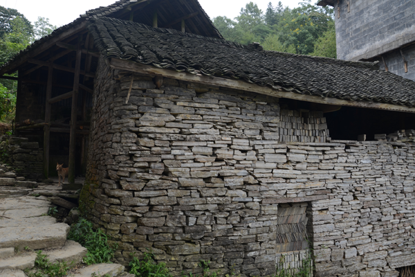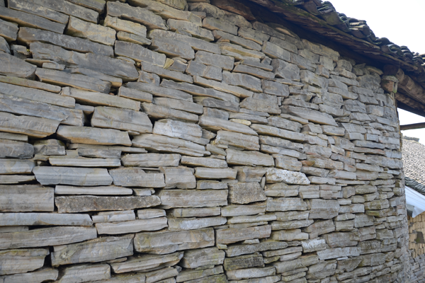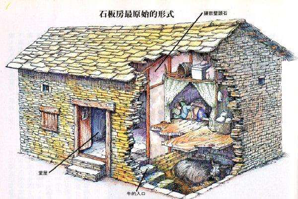 石板房以石條或石塊砌墻,墻可壘至5至6米高;以石板蓋頂,風(fēng)雨不透。總之,除檁條、椽子是木料外,其余全是石料,甚至家用的桌、凳、灶、缽都是石頭鑿的。一切都樸實(shí)無華,固若金湯。這種房屋冬暖夏涼,防潮放火,相對(duì)采光較差。